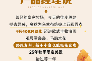 今日徒步行程结束后,我们随即乘车前往【承德】。晚上抵达时,我们将准备好【庆功晚宴】供大家享用。在旅途中成为好友,留住身边的美好!