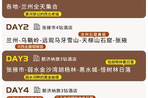 1、住宿:兰州4钻/星酒店标间1晚、张掖市4钻酒店标间1晚、额济纳旗3钻酒店标间2晚、阿拉善左旗3钻酒店标间1晚;