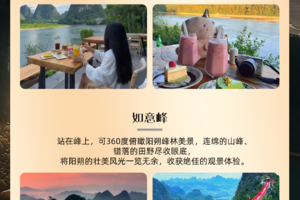 早餐后前往游览【如意峰】,登上如意峰,它位于阳朔县,拥有索道、观景平台、玻璃栈道等设施。站在峰上,可360度俯瞰阳朔峰林美景,连绵的山峰、错落的田野尽收眼底,将阳朔的壮美风光一览无余,收获绝佳的观景体验。
