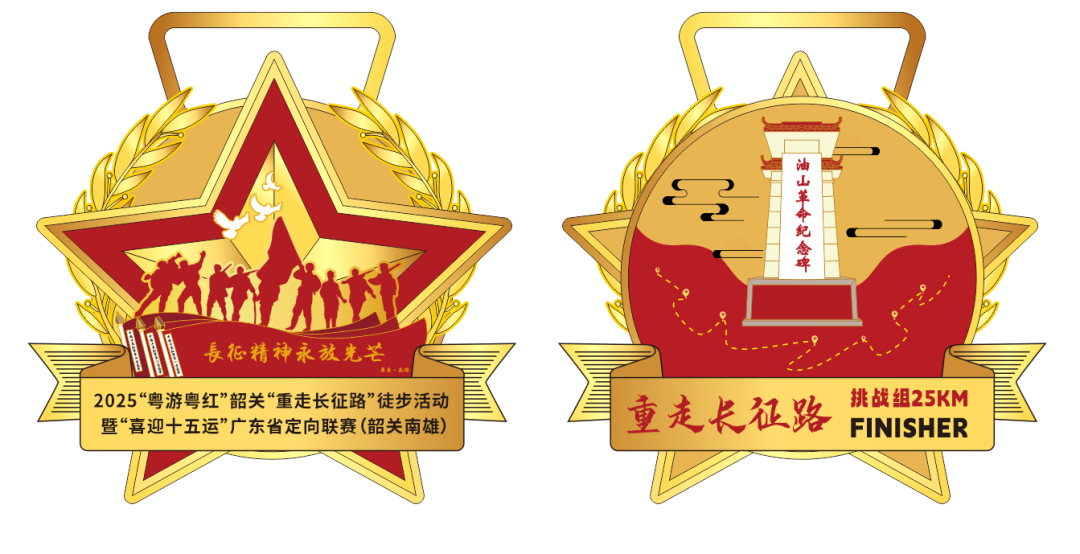 奖牌整体突出长征元素,左侧奖牌融入五角星、红军剪影等元素,“长征精神永放光芒” 传递精神内核;右侧奖牌呈现油山革命纪念碑,展现活动南雄长征故事。它们不仅是完赛象征,更承载着对长征历史的铭记,激励参与者传承红色基因。