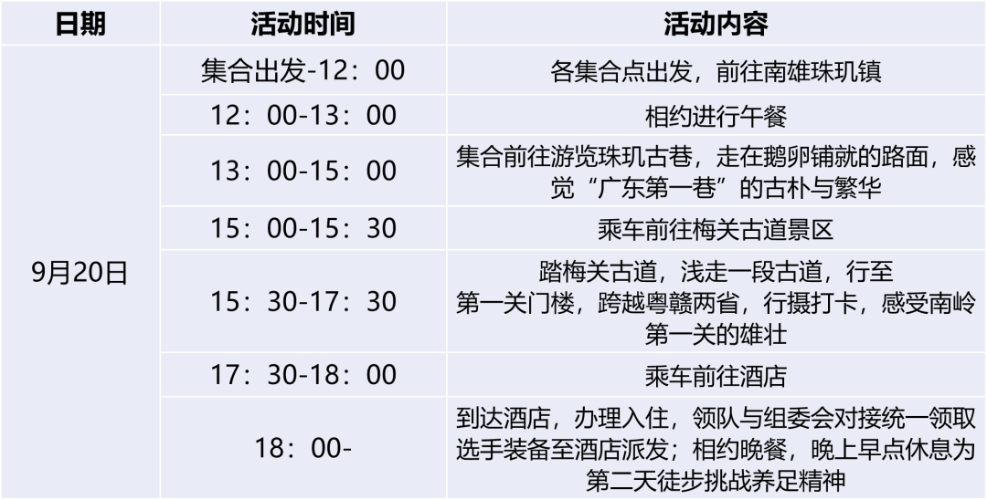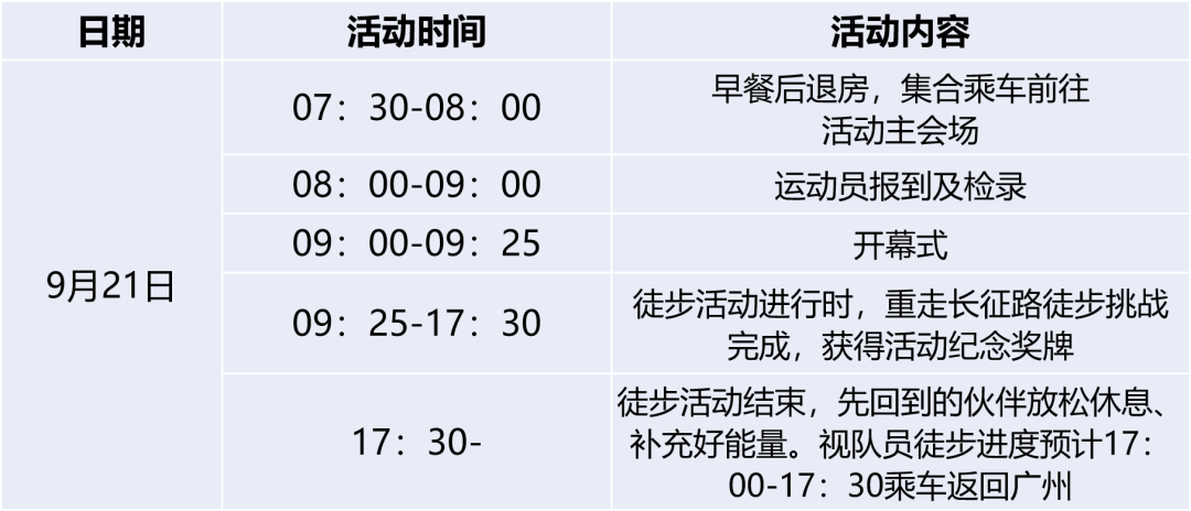 徒步大会日:酒店出发→参加重走长征徒步活动开幕式→重走长征路徒步挑战(关门时间8小时)→回程广佛