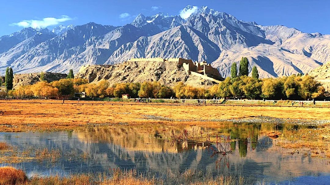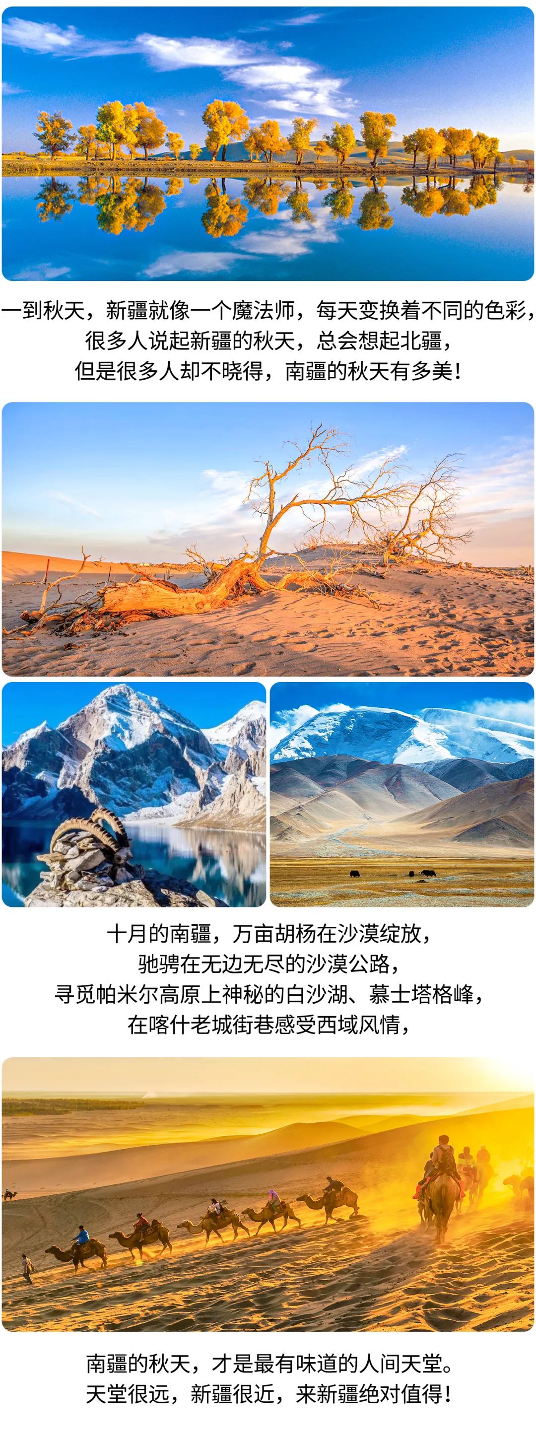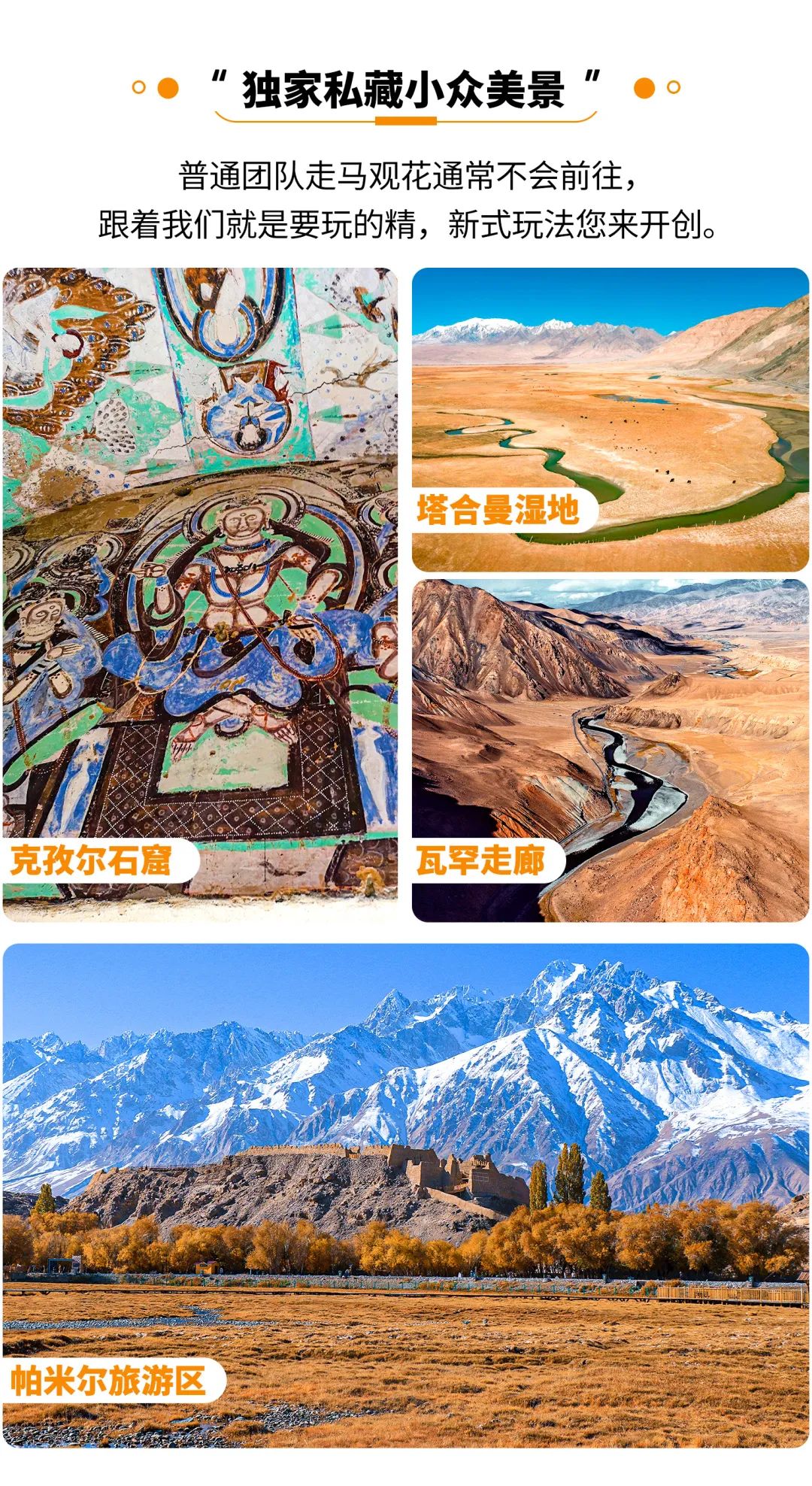 罗布人村寨+塔里木胡杨林+克孜尔石窟+温宿大峡谷+沙漠公路+和田夜市+泽普金胡杨+喀什古城+奥依塔克红山+木吉火山口+白沙湖+喀拉库勒湖倒影+慕士塔格雪峰+石头城&金草滩+瓦罕走廊+盘龙古道+班迪尔蓝湖全景9日