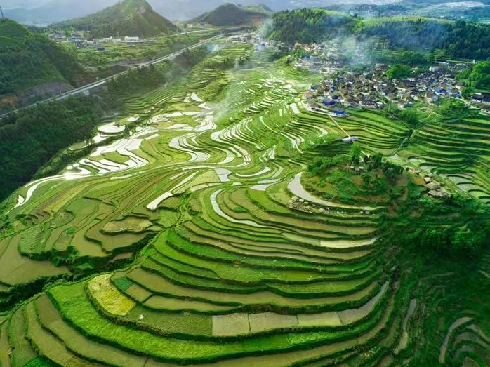 高要梯田,位于贵州省黔东南州丹寨县高要村,是中国最美十大梯田之一。这片由苗族先民历经千年开垦的梯田群,依山势盘旋而上,一千余亩梯田如层层叠叠的“苗家腰带”,从山脚蜿蜒至山顶,勾勒出壮丽的大地艺术画卷。梯田四季皆景:春灌时水光潋滟如明镜镶嵌山间,夏日稻浪翻涌如碧波荡漾,金秋则满目金黄,连山风都仿佛被染成丰收的色彩。