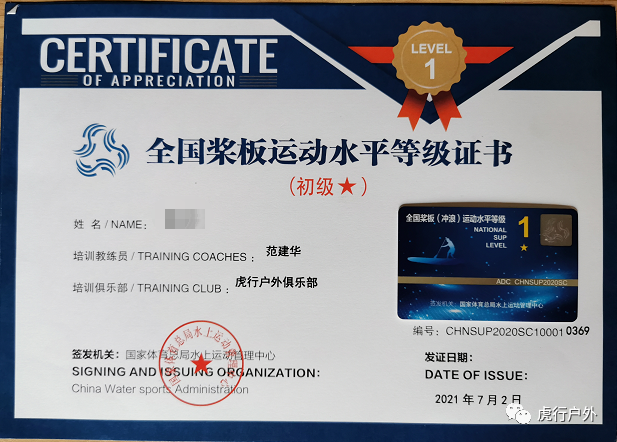 收获专业证书:国家体育总局颁发桨板运动等级证书L1-L3