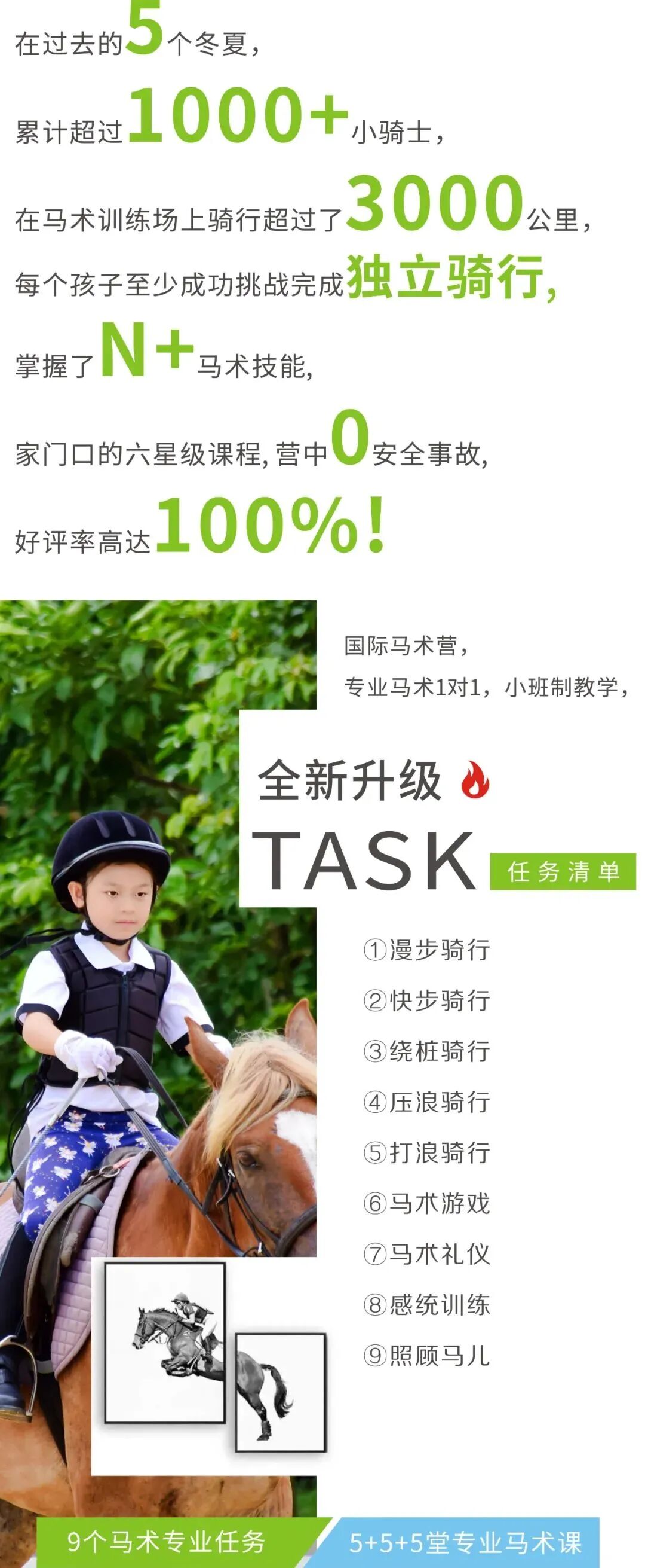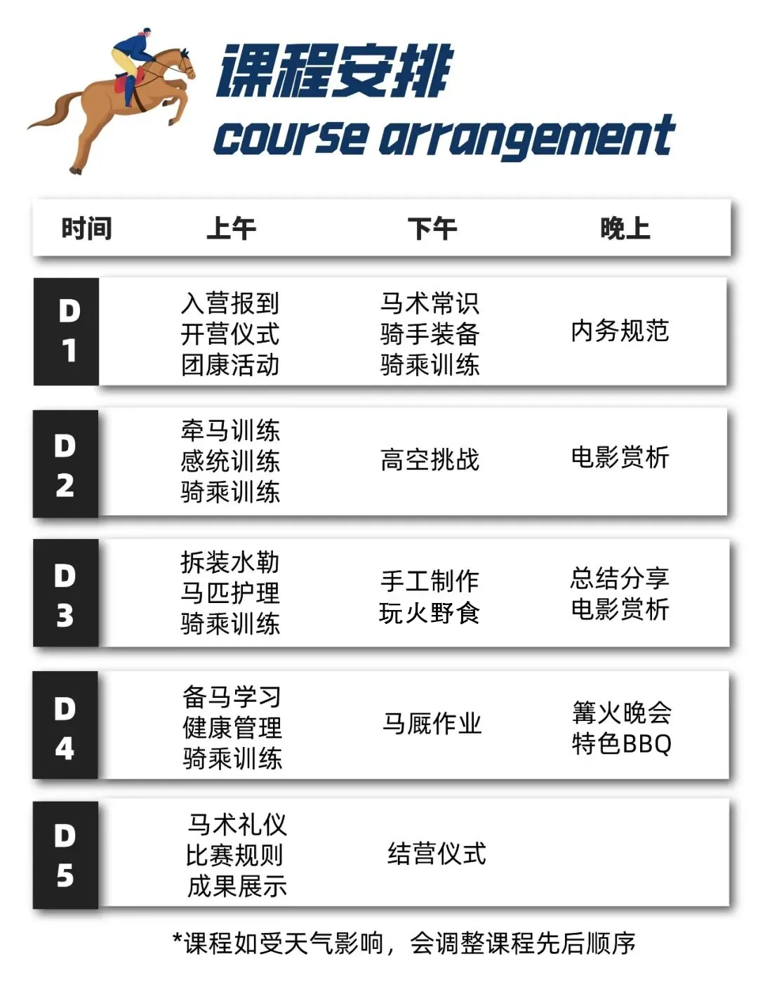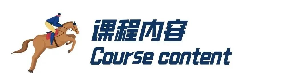骑乘训练:回顾与学习、牵马行走、上下马、慢步、快步、打浪与压浪、直行与绕桩、独立骑行成果展示
