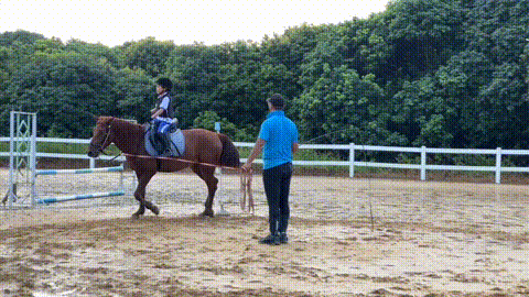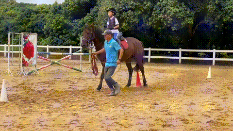 骑乘训练:慢步、快步转换。打直行与绕桩快步打浪、马背上的小游戏