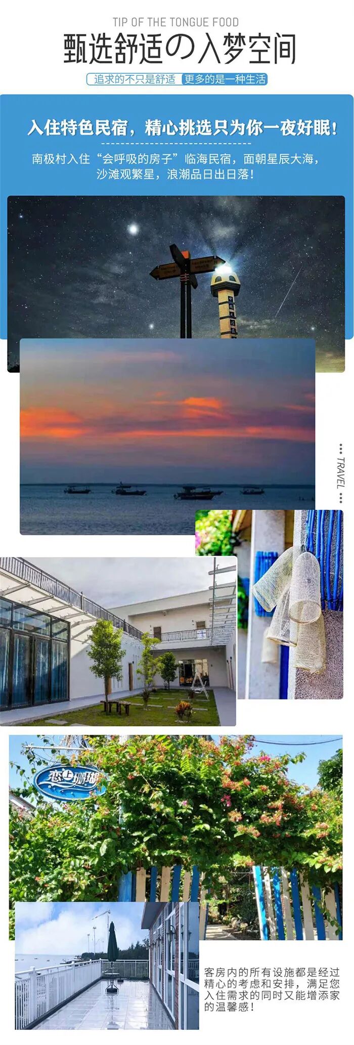 3、住宿:东海岛酒店标间、南极村精品民宿标间(提前5天以上报名保证拼房)。