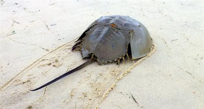 它叫中国鲎,今年3月被世界自然保护联盟宣布“濒危”。它是远古时代的古老生物,早在3.5亿年前的泥盆纪,鲎就生活在地球上,至今仍保持其形态,堪称海洋里的远古遗民,它与三叶虫是同一个期纪的动物。此时原始鱼类才刚刚问世。(恐龙最早出现于2.3亿年前)