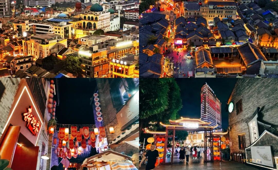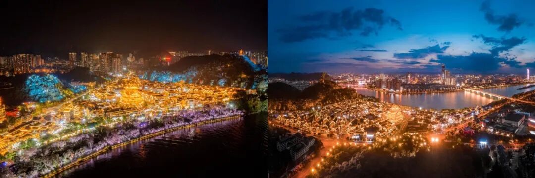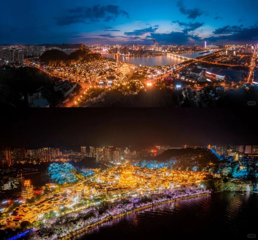 夜晚的窑埠古镇,灯火辉煌,壮族风情街、苗族风情街、瑶族风情街及滨水休闲步行街各具特色,整体建筑融入桂北和西南少数民族风格,古典与时尚完美交融。