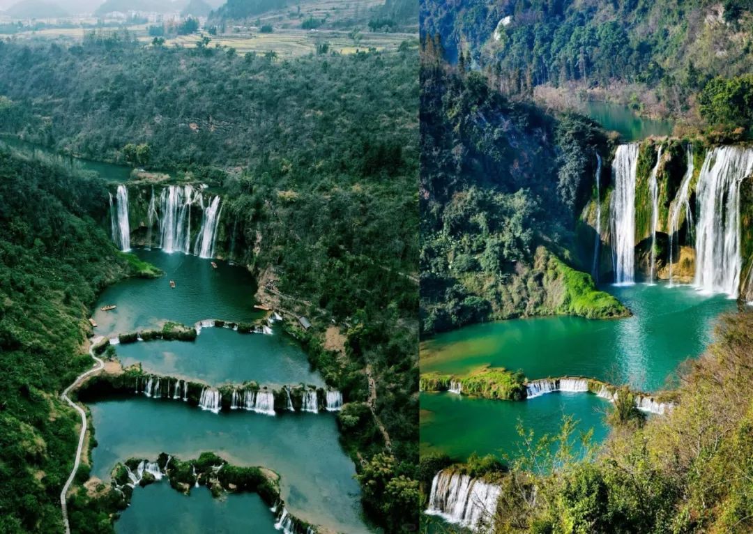 九龙瀑布群真的太壮观了!这里有很多个瀑布,一个接着一个,水流从高处倾泻而下,发出震耳欲聋的声音,溅起的水花在阳光的照射下形成美丽的彩虹。
