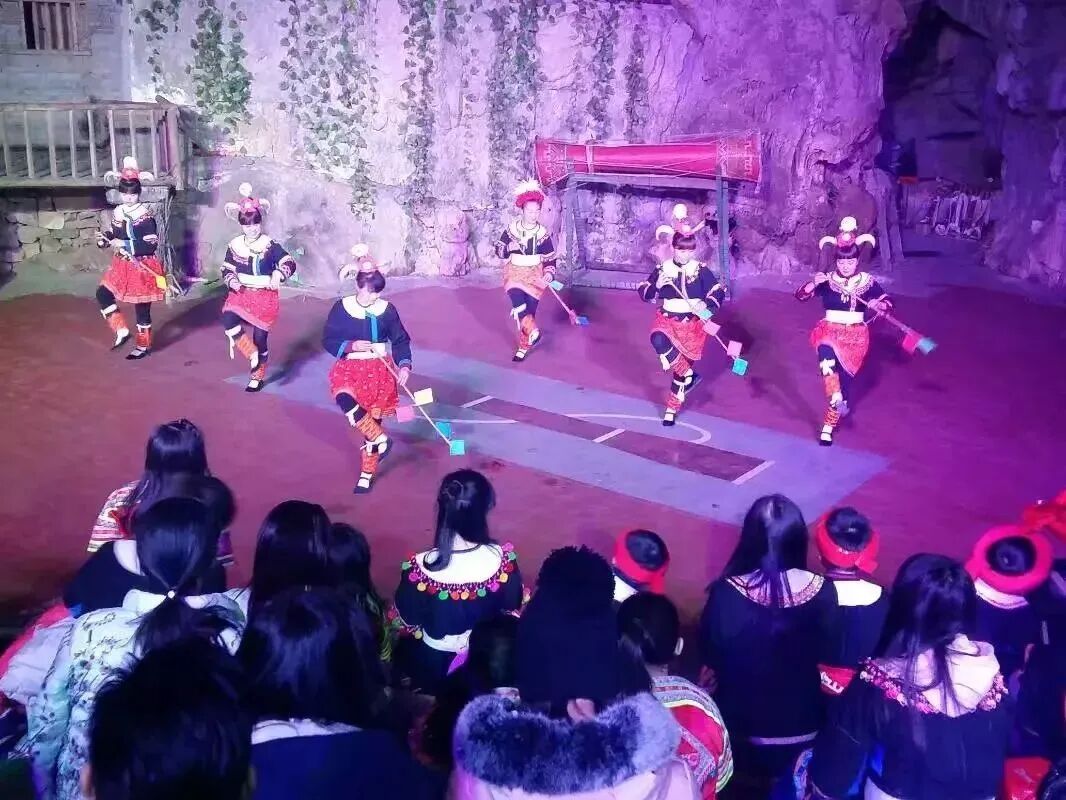 19:00 参加瑶寨举行的瑶族特色的【篝火舞晚会】,观看瑶寨歌舞表演,参加互动环节与阿哥阿妹牵手共舞。