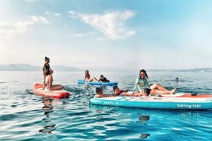 听从领队安排以及项目讲解,分组分批次领取浮潜和桨板工具,全程穿着救生衣,自由约伴下海玩浮潜/桨板(如人多,每个项目需限时体验60分钟,如人少则不限时体验)。