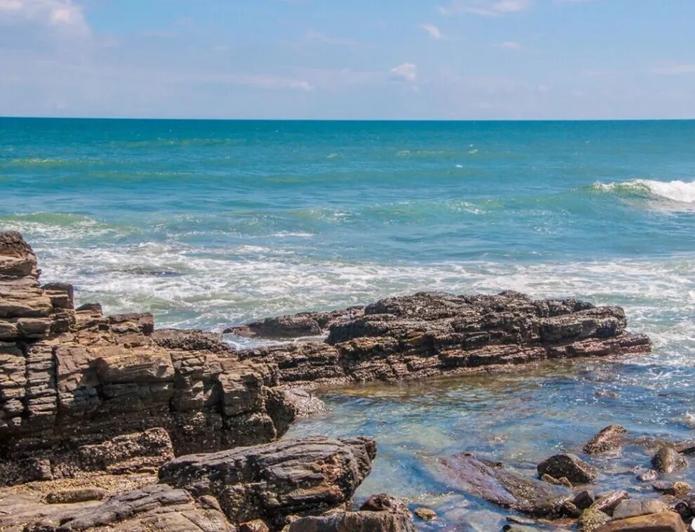 蓝色大海与黑色礁石的梦幻结合,带你领略独特的黑色礁石,欣赏大海的蓝与礁石的黑梦幻叠加。