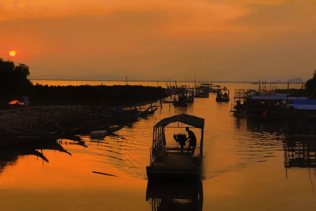 这里有大片的海滩红树林,可以乘小船探秘红树林,傍晚来这里可以看到大群的白鹭归巢,等退潮时可以欣赏到七彩的滩涂,随手一拍一幅绝美的日落大片就有了。