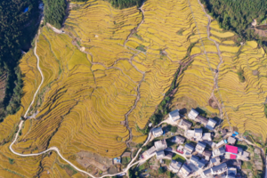一层层、一排排的水稻梯田一片金黄铺陈在眼前