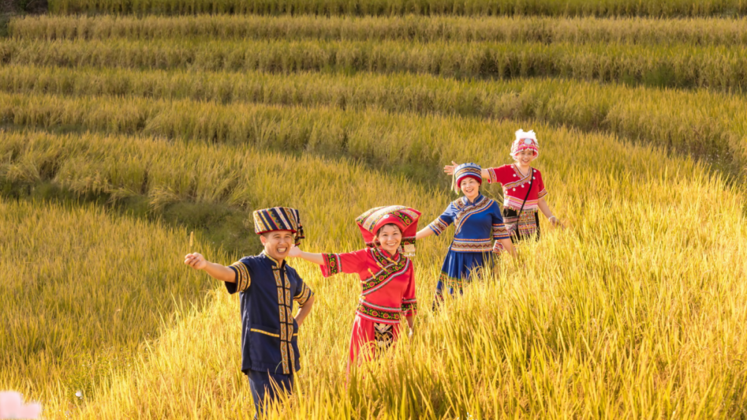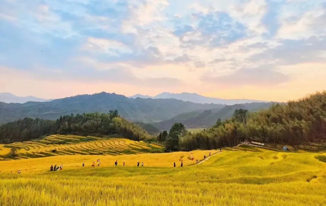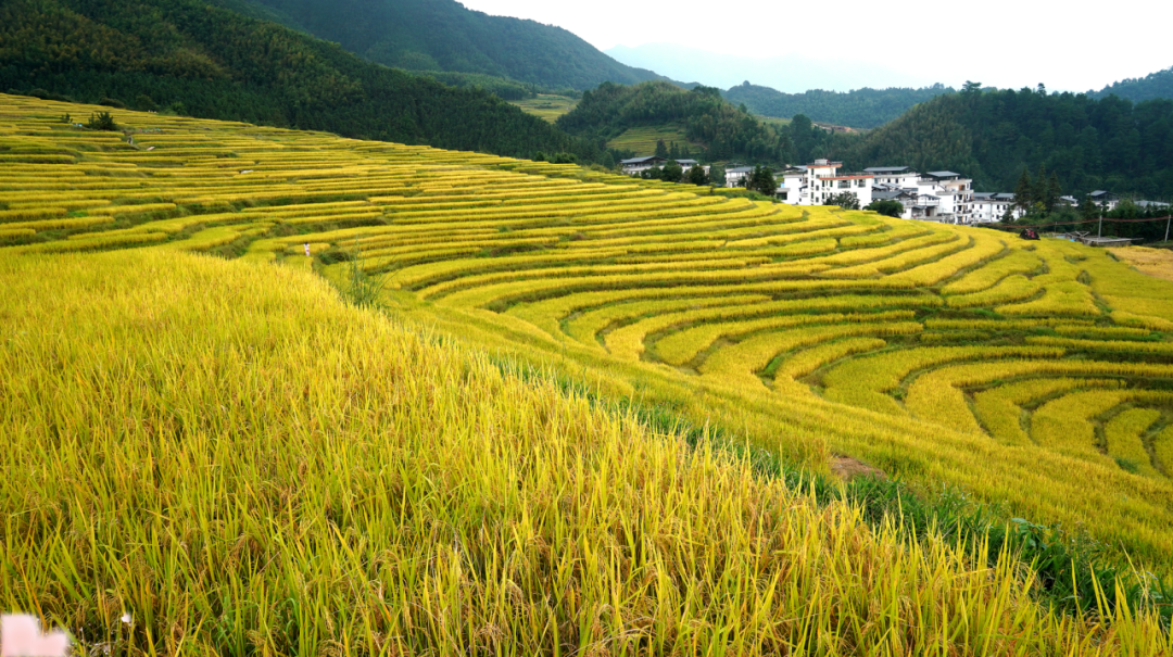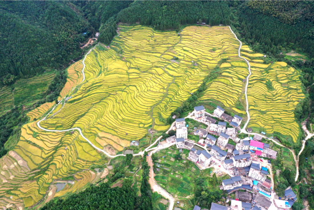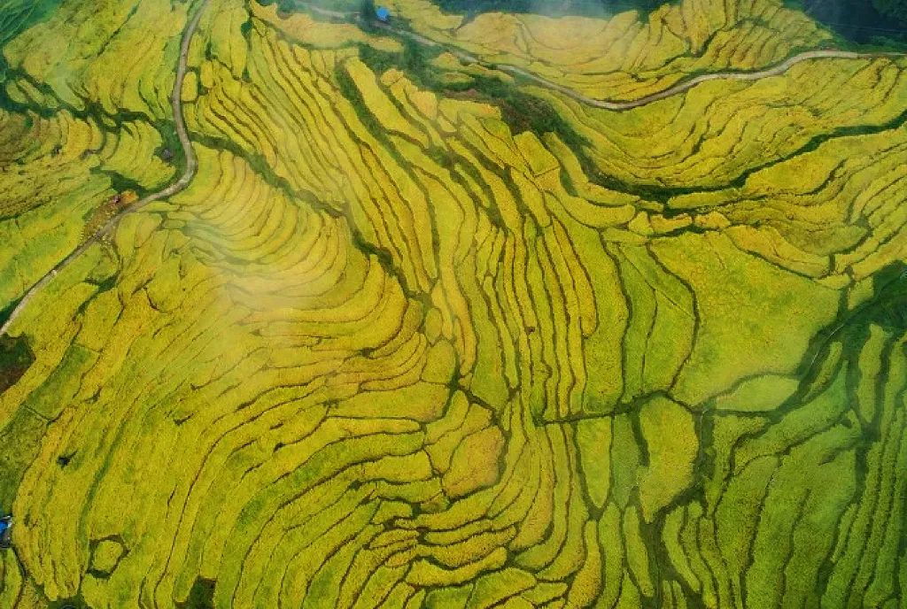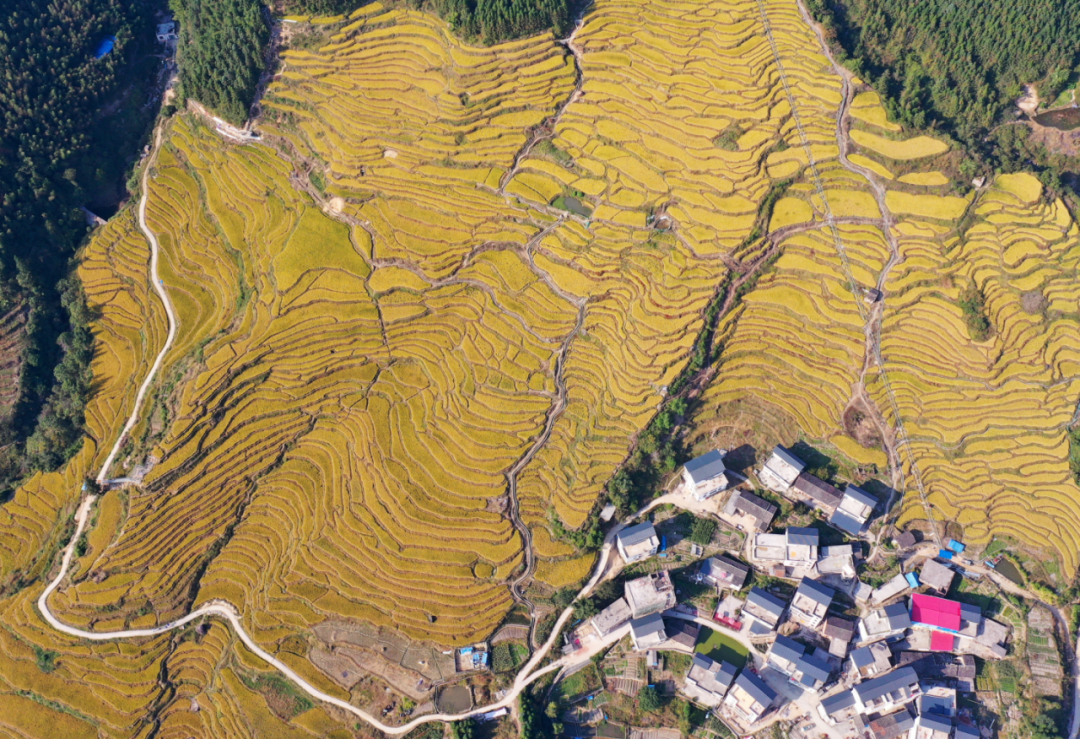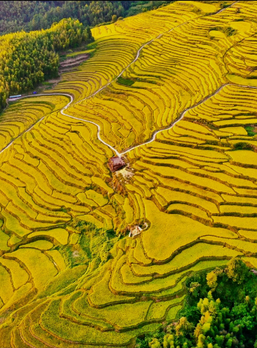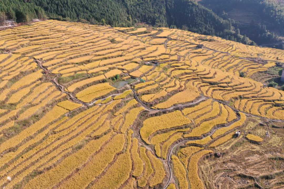 层层叠叠的梯田线条勾勒出一幅美丽的丰收画卷。