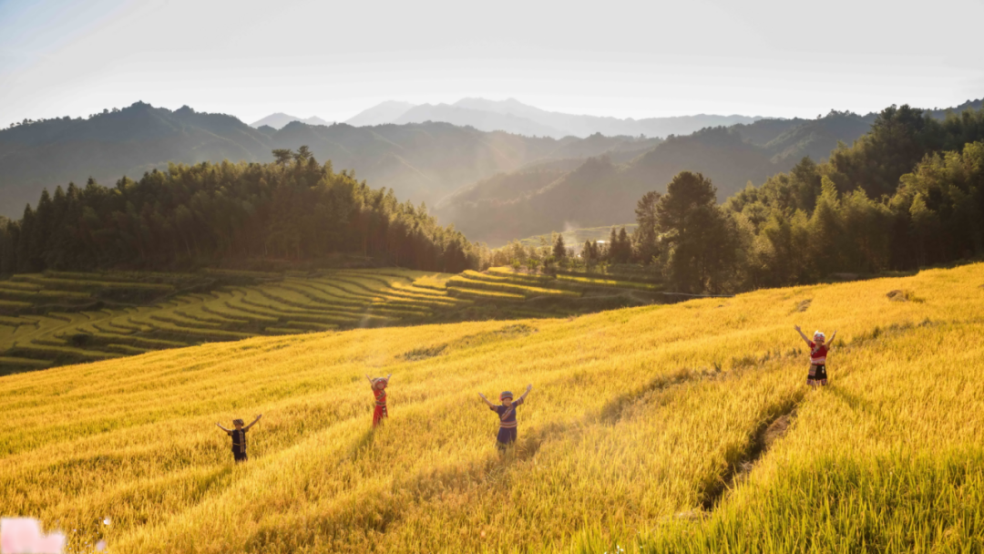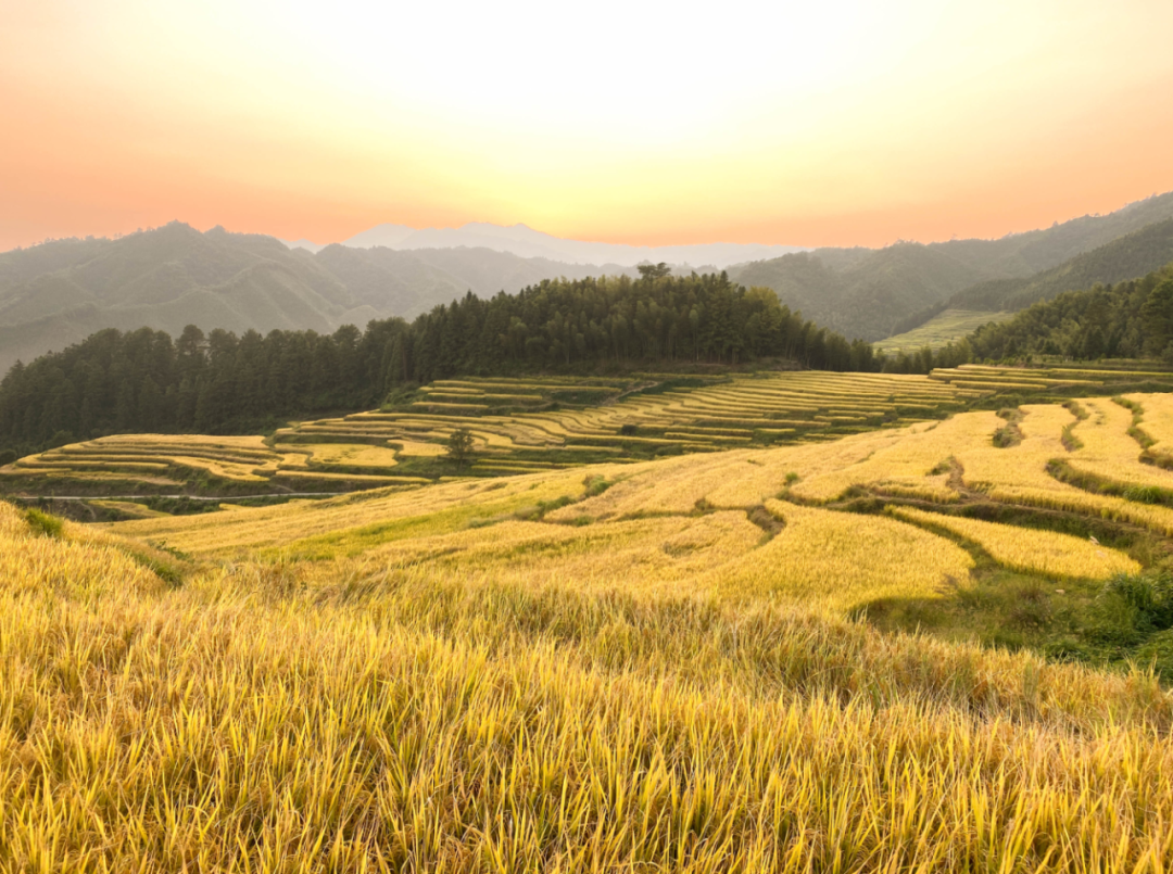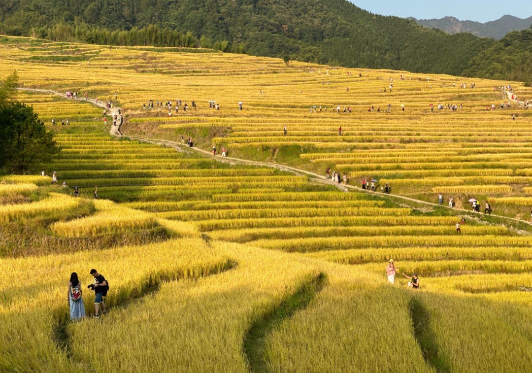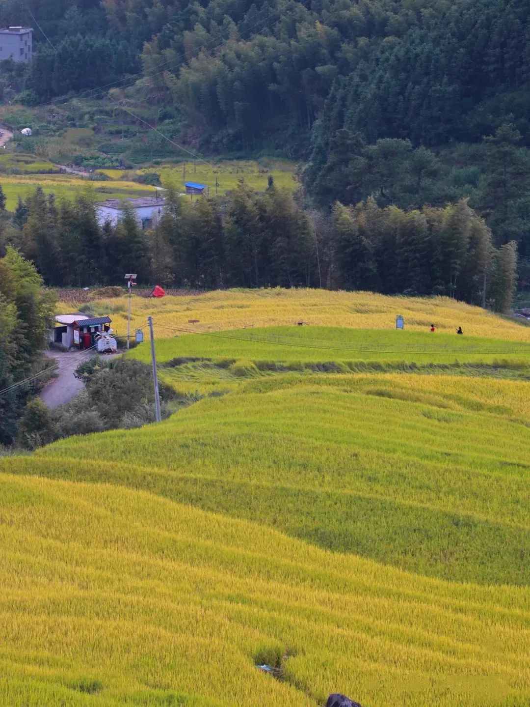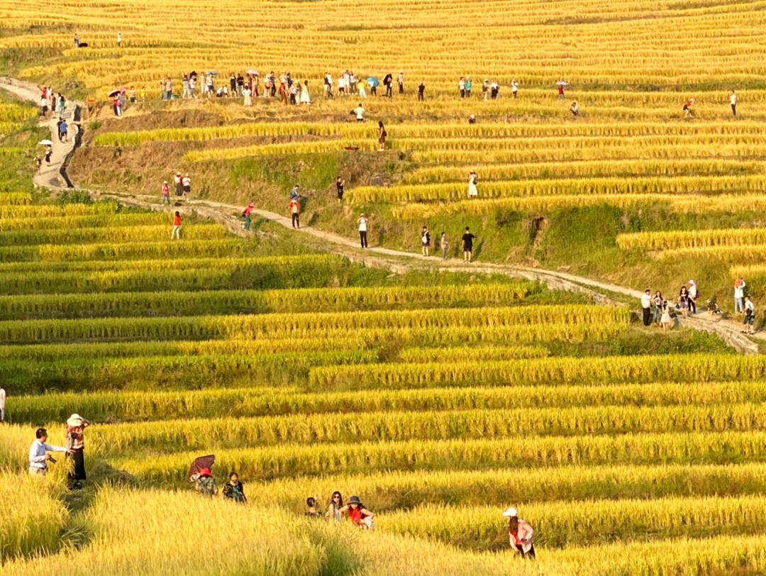 一层层、一排排的水稻梯田一片金黄铺陈在眼前