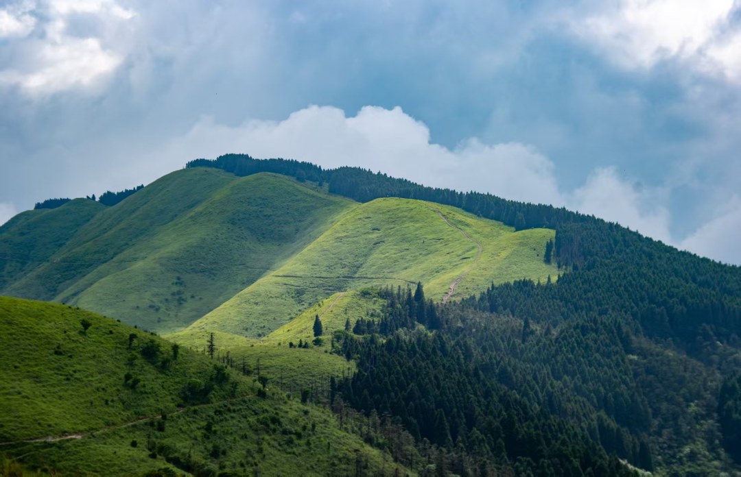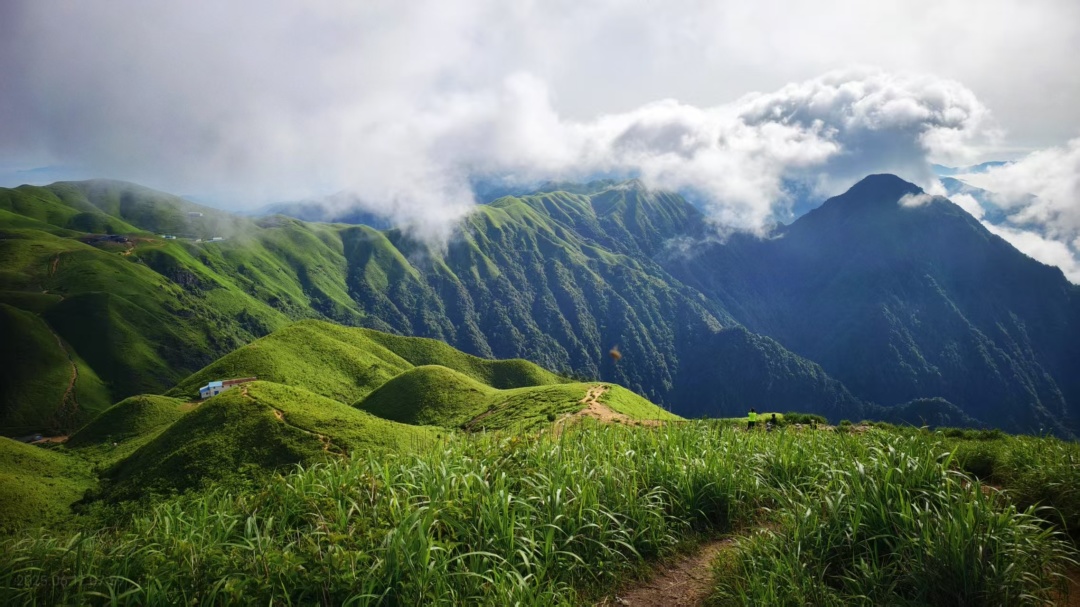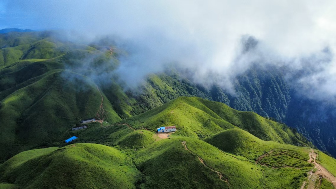 满眼翠绿的高山草甸,云雾飘渺的山巅