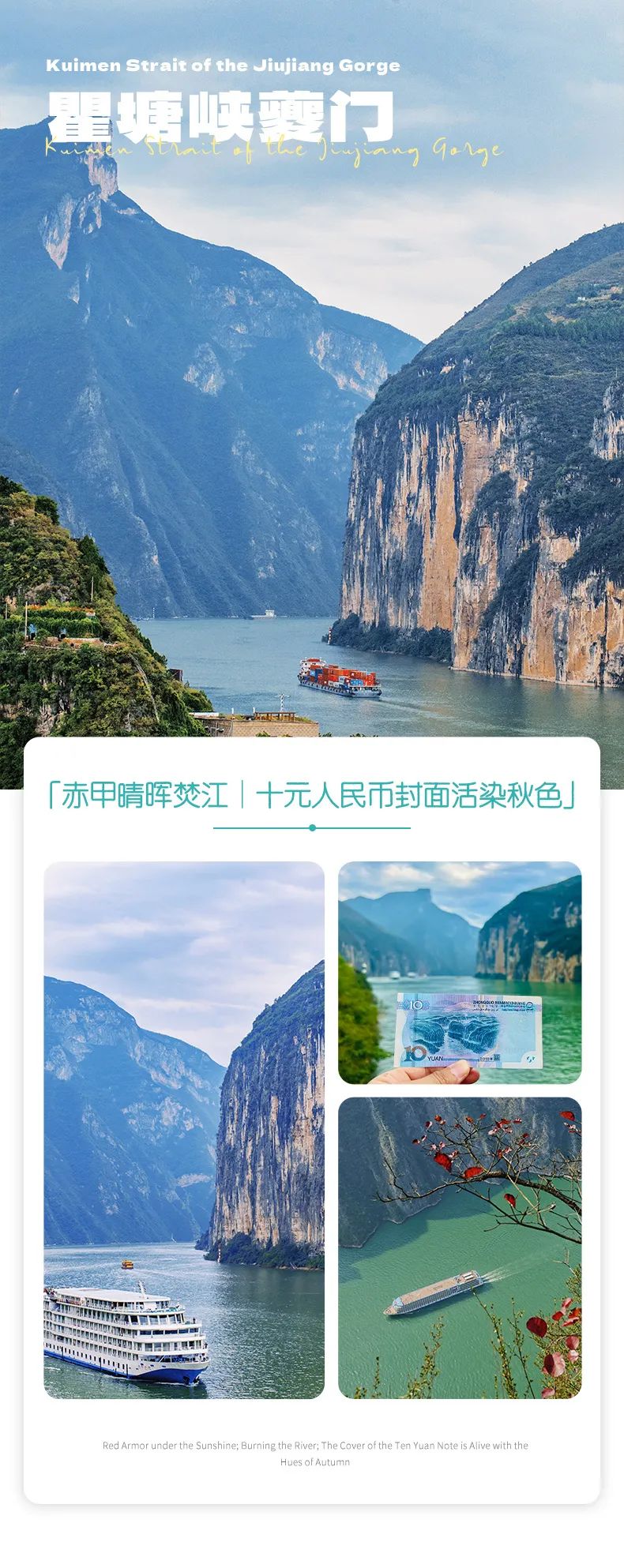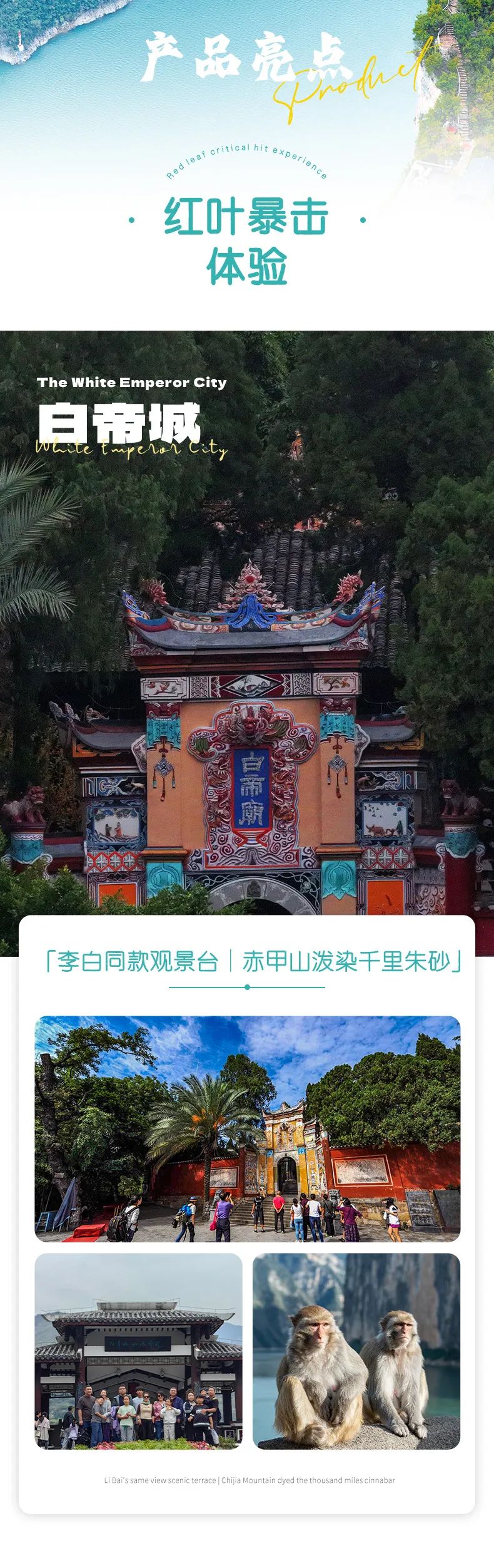 在白帝城,在白帝城,感受一下古诗词的文化魅力。并且还可以了解白帝城托孤的典故,以及喂一喂“两岸猿声啼不住”的后代。最后打卡10元人民币背景——夔门。