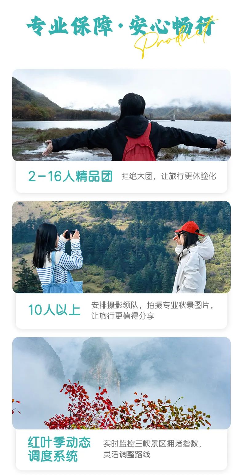 3. 本产品属于秋季产品,秋景确定时间不确定的,正常是11月份秋景,但是也有提前或延后情况,游玩时请合理对待实际景色;
