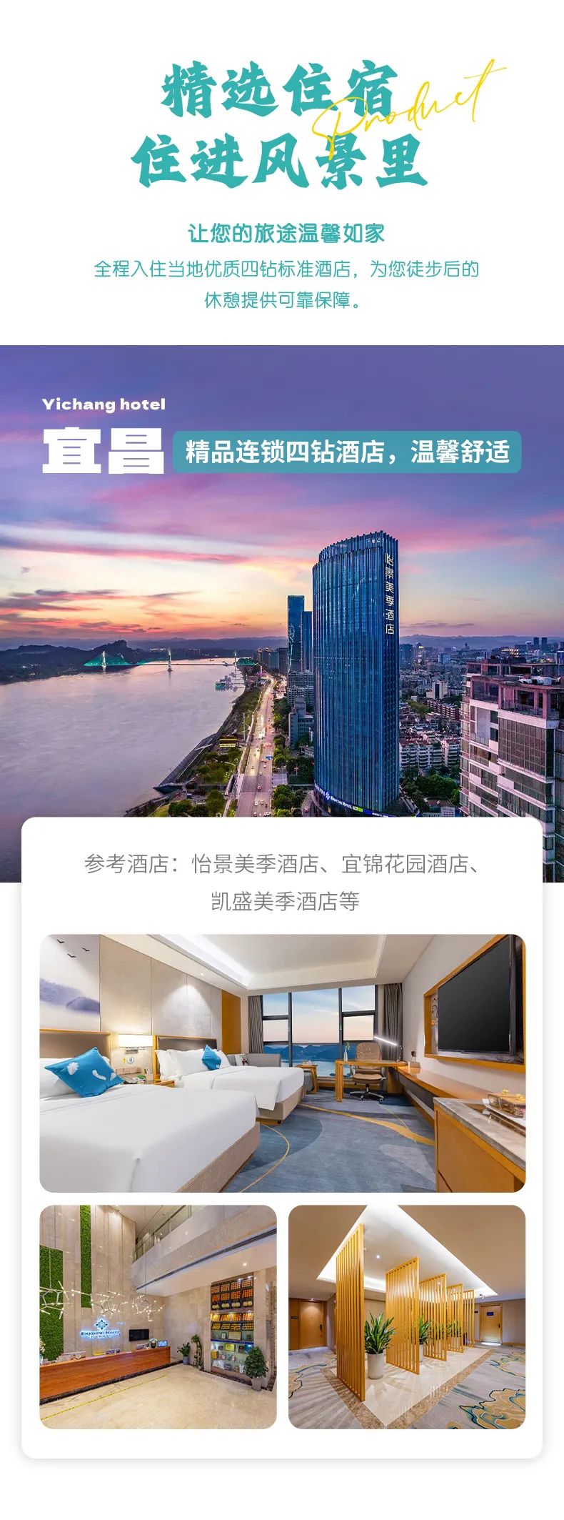 2. 住宿:宜昌江景四钻酒店住宿1晚(参考怡景美季酒店、宜景美怡酒店、丽橙酒店等)、巫山高端四钻酒店住宿2晚(参考希尔顿惠庭酒店、温德姆酒店、江山红叶酒店等);