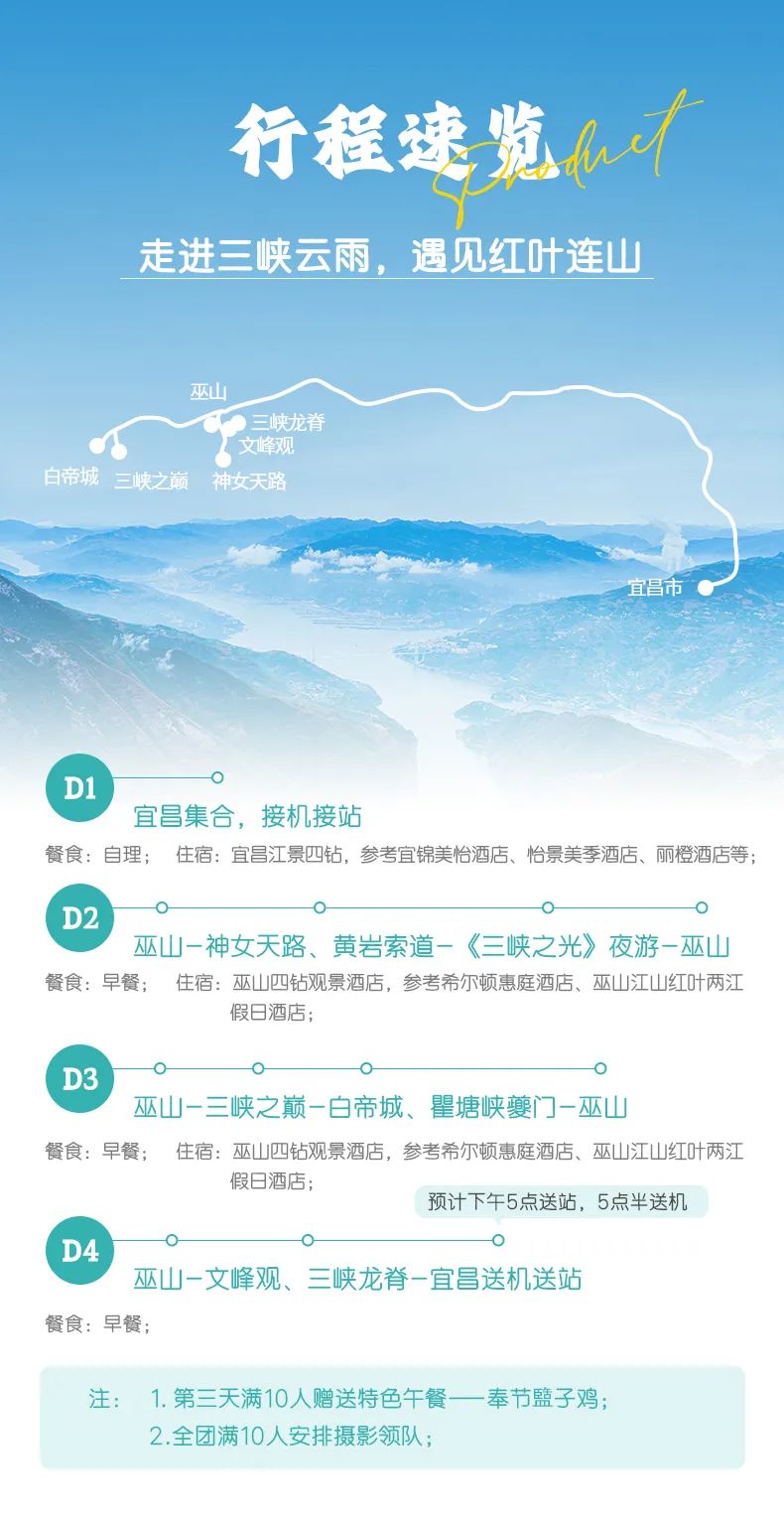 2. 由于此产品游览区域属于巫山、奉节,经济发展缓慢,物资匮乏,旅游资源条件有限,无法与一二线城市旅游资源比较,如遇相关问题敬请谅解