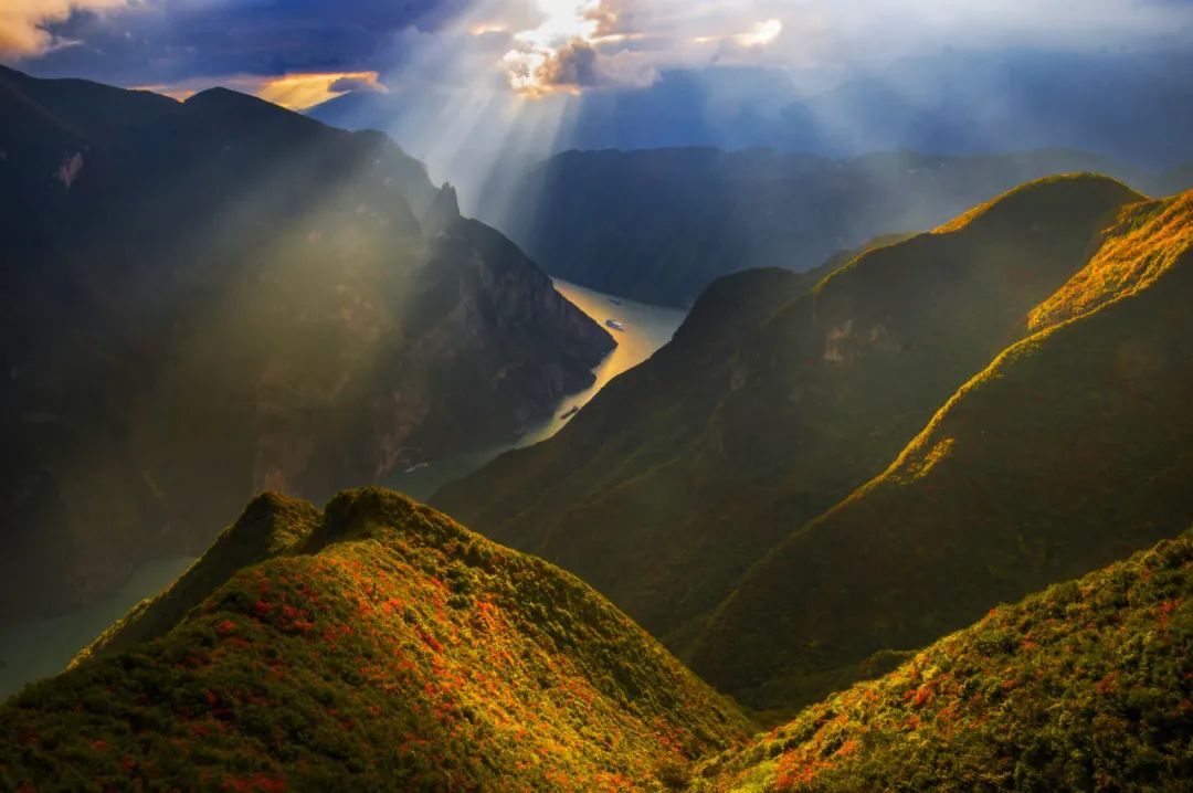 立长江脊梁之巅,1388米云台尽染赤焰!瞿塘峡八百里江山化作熔炉——夔门为炉口,赤甲山为薪柴,秋霜一点,漫山黄栌、枫香、乌桕轰然燃烧!登临处,江流如碧带蜿蜒,游船似金梭穿行,而脚下千峰叠嶂,正以最炽烈的红向苍穹献祭。