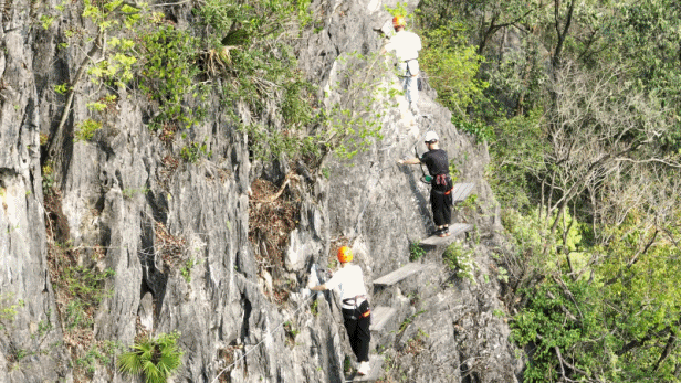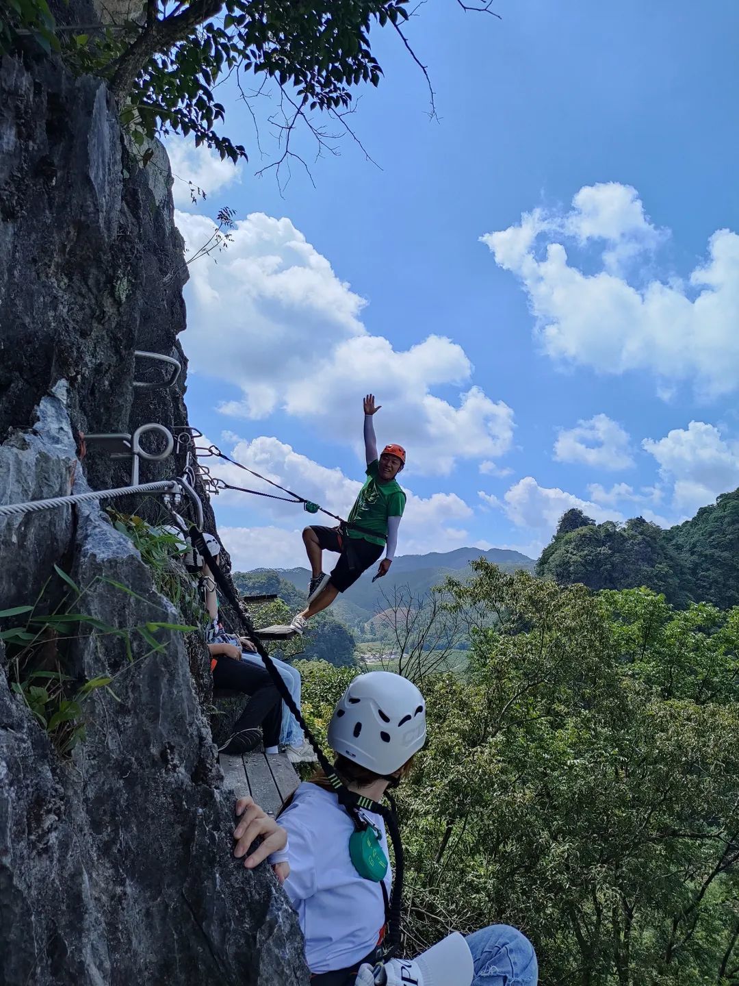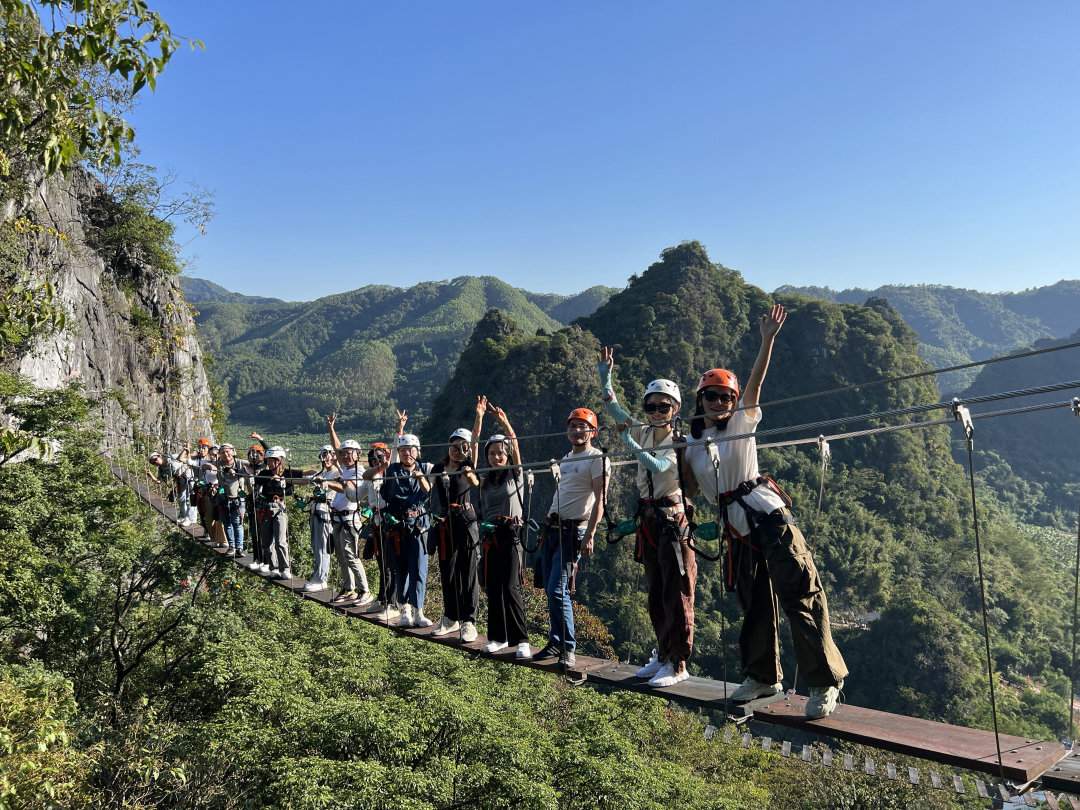 选择2:挑战飞拉达,领队带领大家热身,领取装备,听教练讲解活动要领。 开始飞拉达,在山间飞檐走壁,体验空中攀岩的刺激与乐趣。