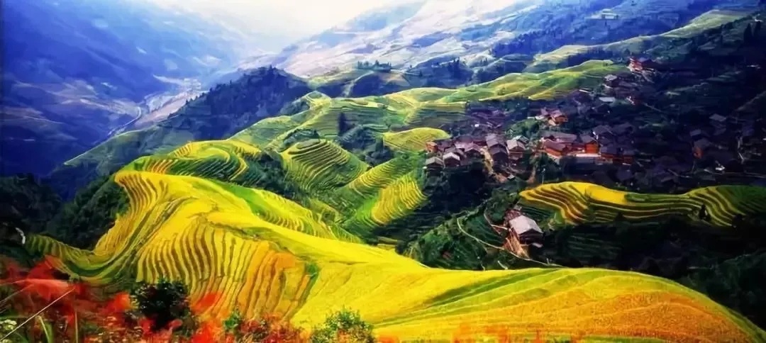 这片梯田在海拔400-800米之间,每年秋天,这里都会收获一大片金灿灿的金黄稻田,这景色绝对美爆了,一层层的山间梯田非常富有层次感