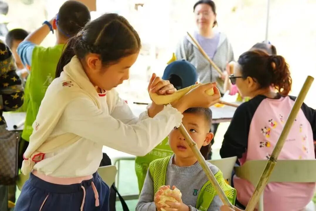 在一起动手制作乡村版的“烤面包”,把发酵好的面团缠绕在竹棍上,再放到炭火上慢烤。