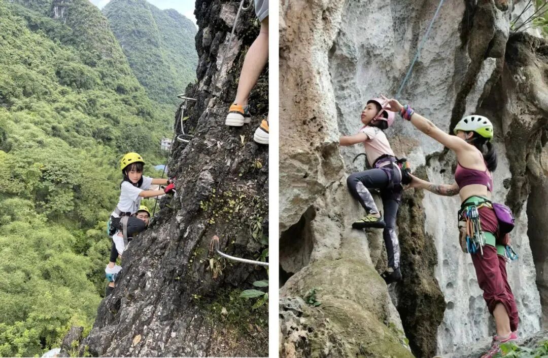 喀斯特地貌下造成了奇绝陡峭的山峰。我们以“崖壁攀岩”的形式,采用飞拉达路线,保留野外攀岩的惊险刺激,让孩子在攀爬中,近距离观察山峰表面,感受喀斯特地形地貌的魅力,同时突破自我、挑战极限,收获勇敢与自信。