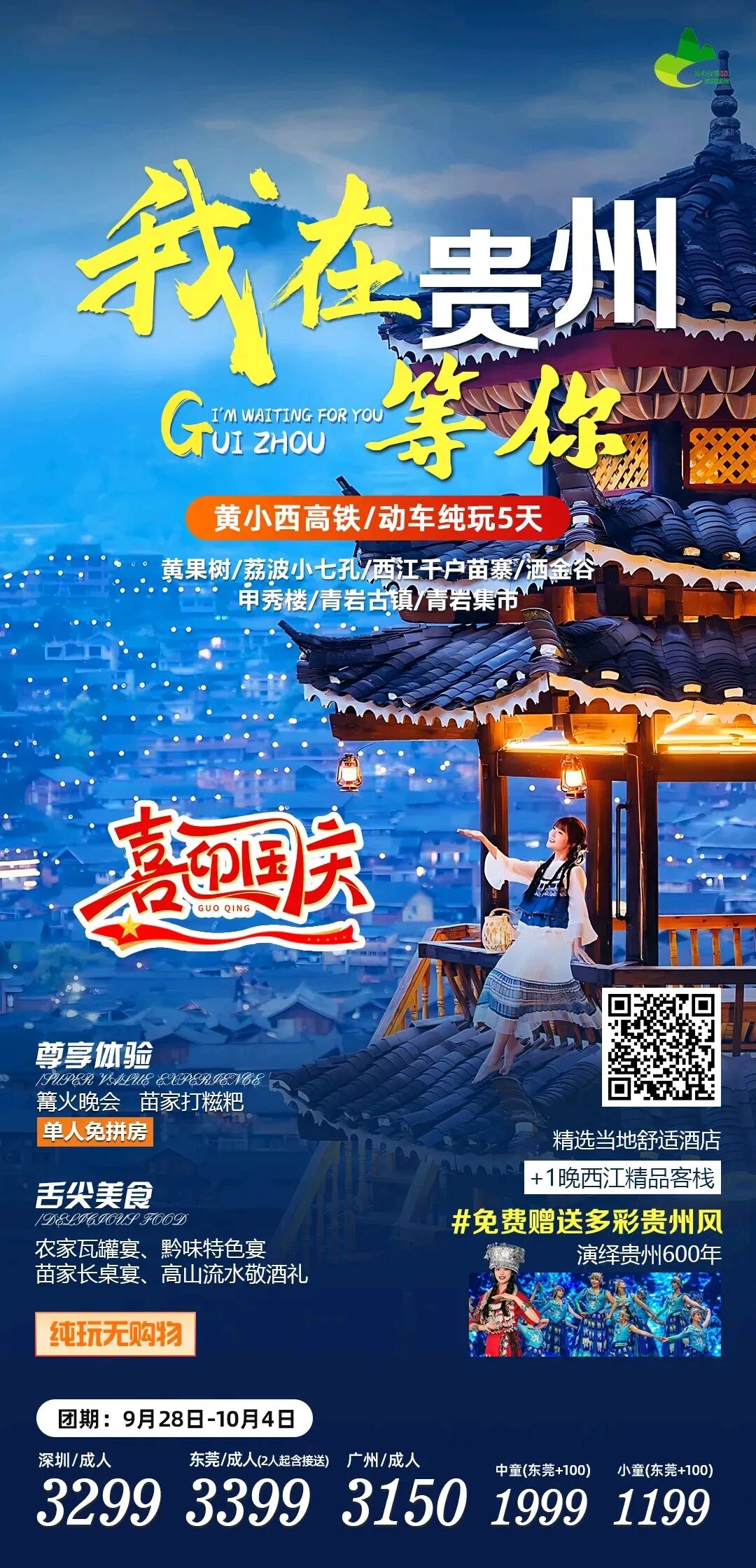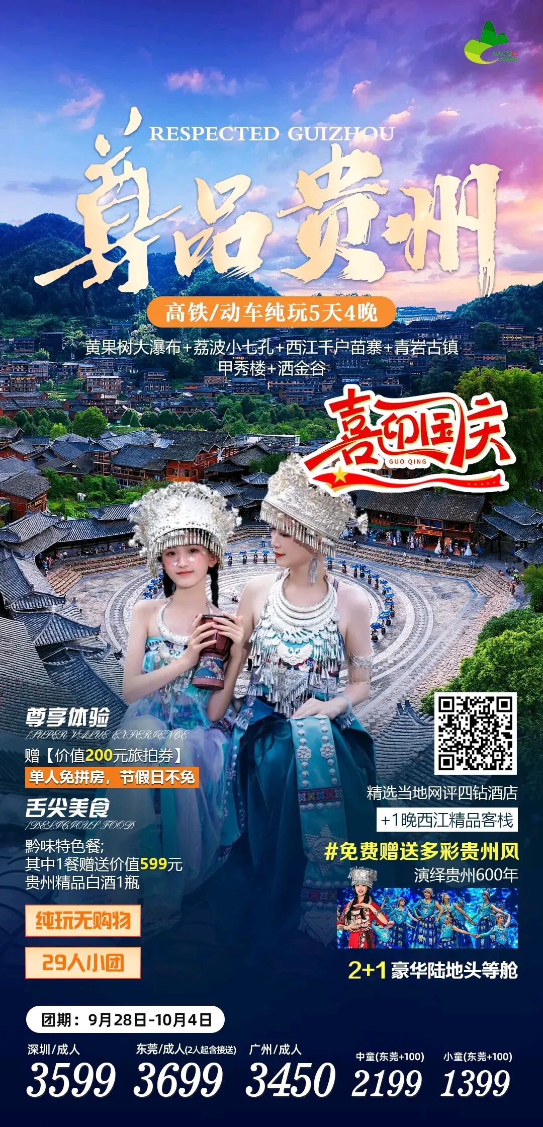 温馨提示:自由活动期间请注意人身财产安全,当天导游会以短信或电话形式通知次日出行时间和注意事项、请保持手机畅通。广州南,换乘动车前往贵阳北/东。