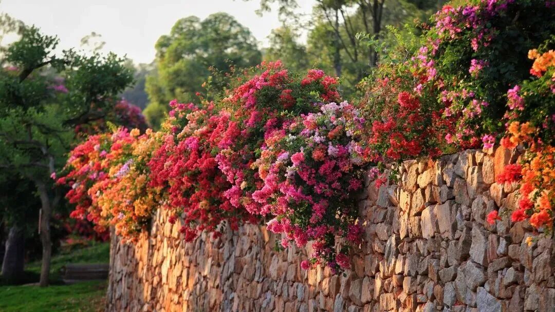 园内建筑古典雅致,亭台楼阁移步易景,与花卉景观相得益彰 。有80年以上树龄的五雀三角树嫁接五颜六色的三角梅,形成独特花海,颜色多样,姿态各异 。