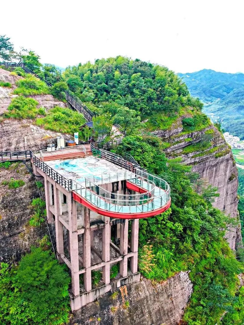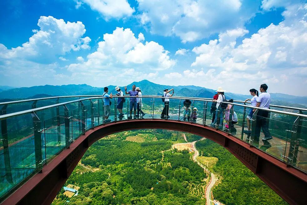 站在玻璃眺台上,放眼望去,一览众山小之感油然而生,山下的田园风光、传统村落,错落有致的万亩桃林风光尽收眼底,仿佛来到了陶渊明笔下的“桃花源”,如仙如醉。