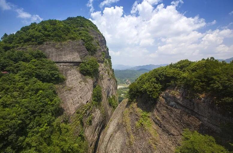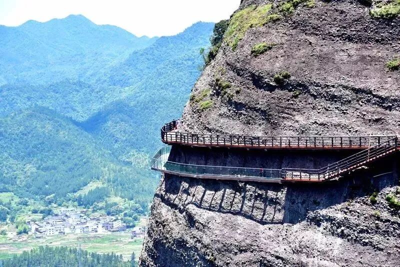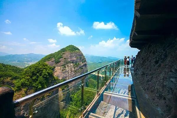 南武当玻璃栈道全长219多米悬挂在海拔600多米的岩石上,沿峭壁而建站在栈道往远方看去,栈道与山脉环抱