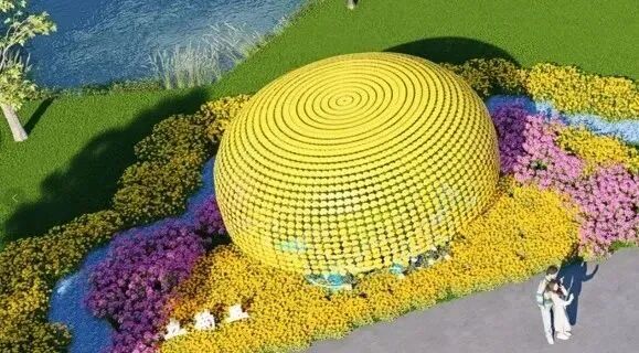 亮点三 荷兰风车花园用菊艺扎作出风车、木鞋、花田;法国画廊花园用菊花搭建地标性建筑物凯旋门;德国啤酒花园以黄菊动态呈现流动的啤酒;英国巴士花园模拟打造双层复古巴士、电话亭、伦敦桥场景。