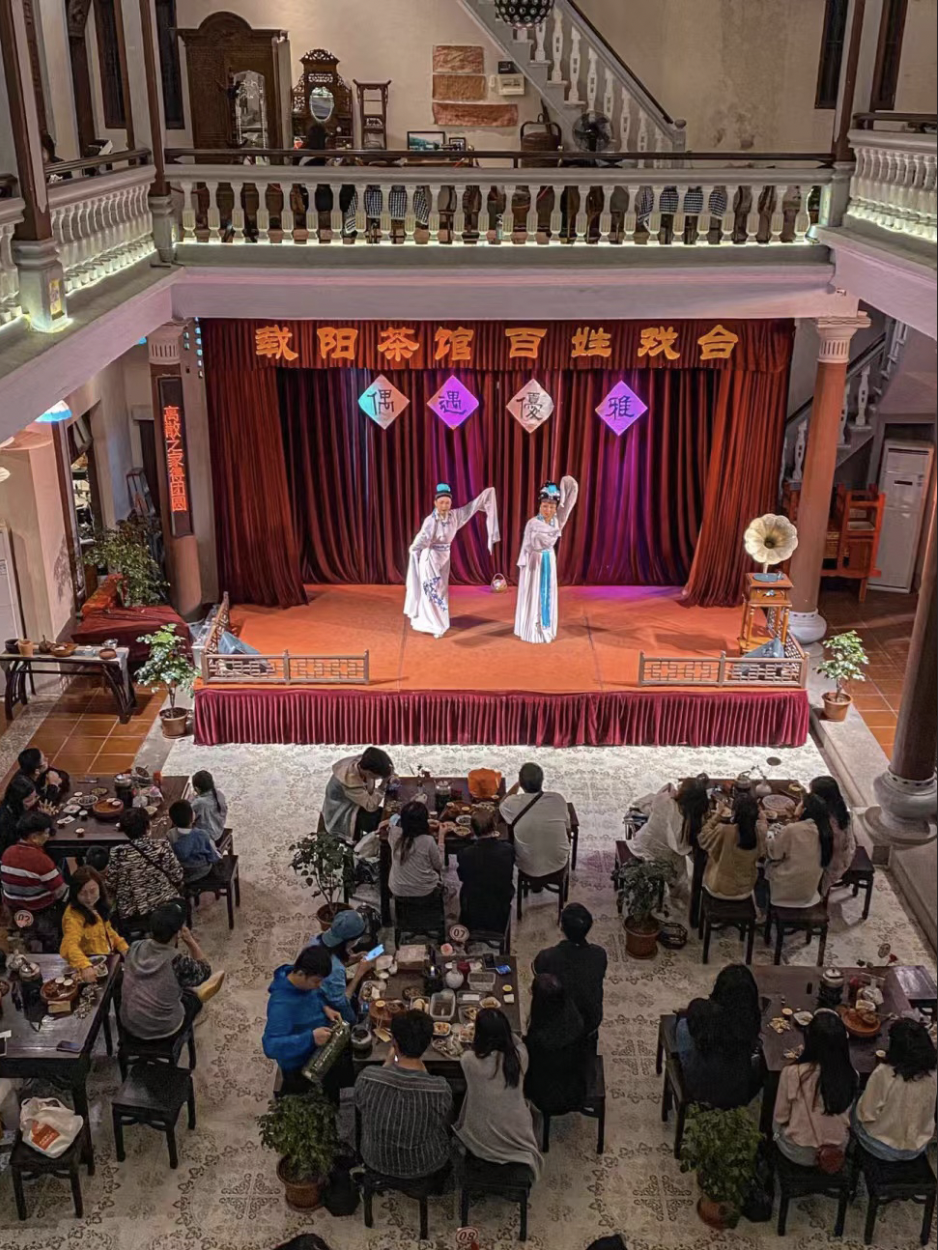载阳茶馆是潮州首个配备戏台的传统茶馆,集潮州建筑文化、茶文化、戏剧曲艺文化于一体的潮州传统文化体验中心。坐在茶馆喝茶聊天、观赏潮剧、听潮人讲古是一种无比美妙的体验,宛如时光倒流,回到旧时潮州,感受她昔日的繁华。