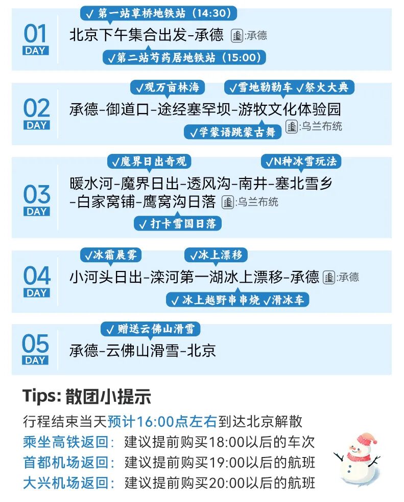 午餐后,我们继续滑雪,下午14:00大家退还雪具,集合返回北京解散,大约16:00,我们到达北京,结束愉快的冰雪狂欢之旅!期待我们下次相遇哦~