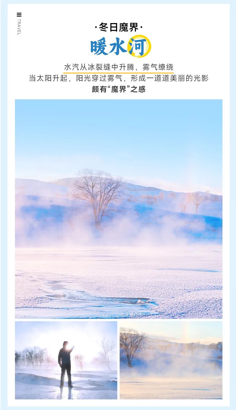 今天我们要早起,乘坐越野车前往号称“魔界”的【暖水河】观赏日出(车程约40分钟),我们在坡顶支好摄像设备,可以看到沟地的河流还有未冻结的部分,日出时分水雾蒸腾起来,烟雾缭绕...太阳逐渐从地平面升起,从远方的山坡间“挤”了出来,天边的云从暗青色转为了暖橘色、粉色...大家要耐心等待日出,一定不会让你们失望!