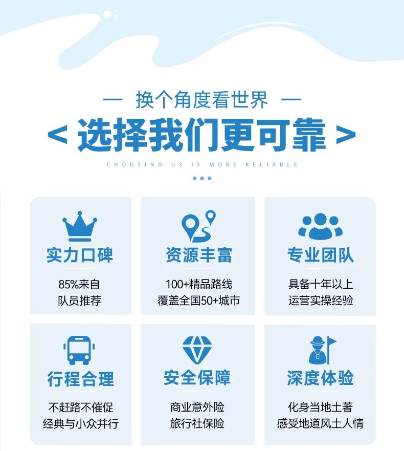 注:8人内司机兼向导(含8人),8人以上安排1名资深领队,15人(含15人)及以上安排摄影师跟团旅拍