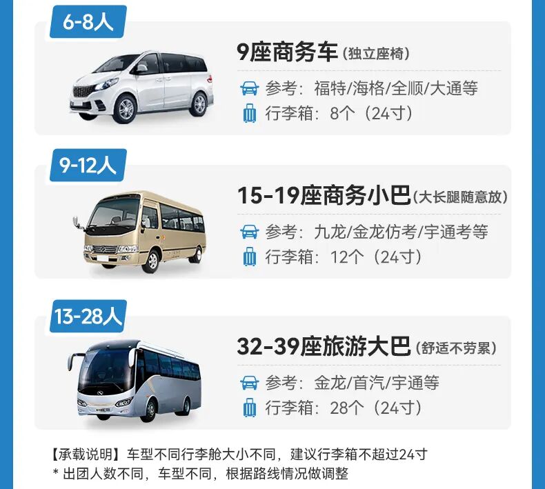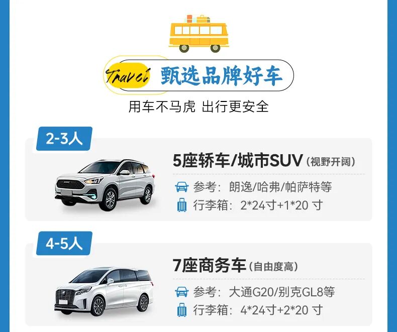 注:8人内司机兼向导(含8人),8人以上安排1名资深领队,15人(含15人)及以上安排摄影师跟团旅拍