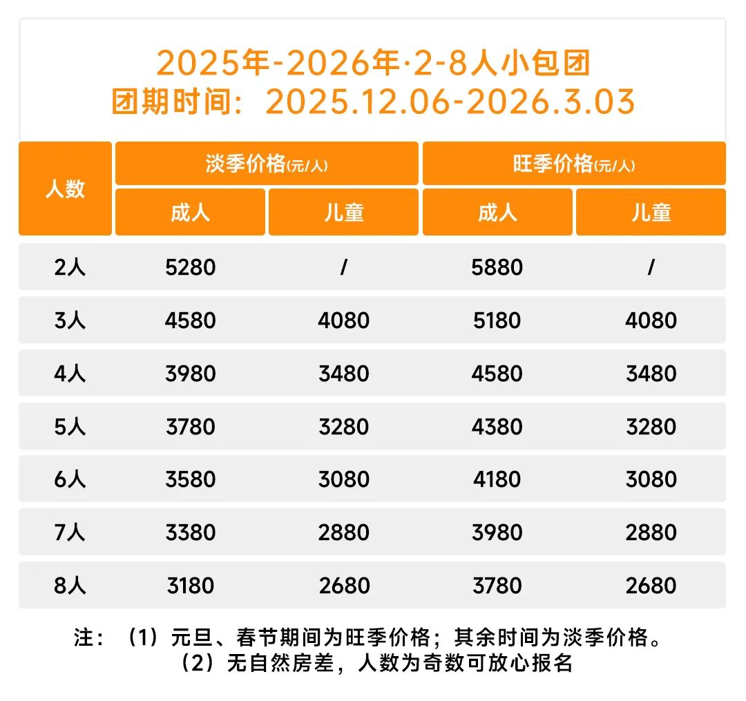 以上团期:2980元/成人;2280元/儿童