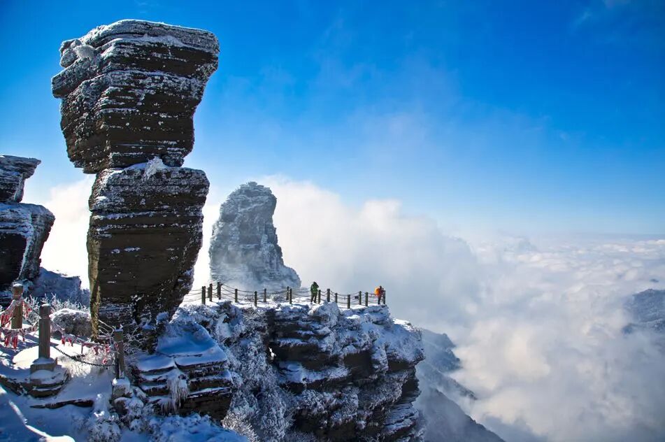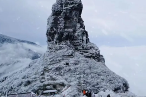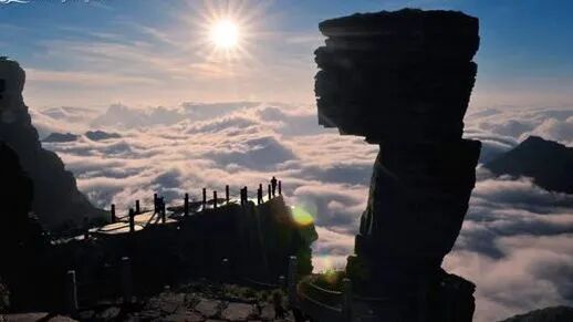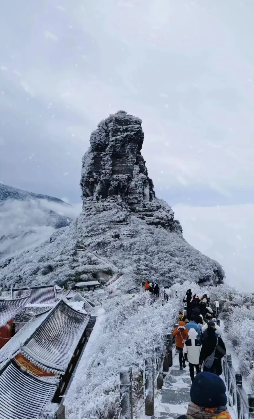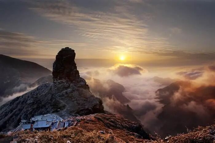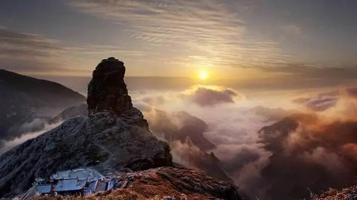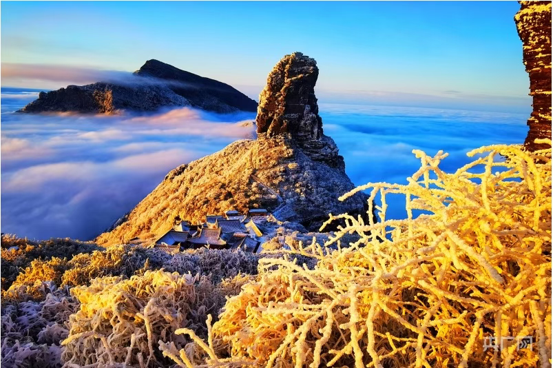 伴随穿破云雾的第一道阳光,梵净山云雾翻腾,视野逐渐通透,金色阳光洒满山间,“光雪雾”的交汇,梵净山美若仙境