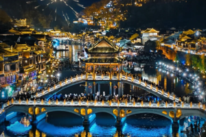 凤凰古城,位于湖南省湘西土家族苗族自治州的西南部,土地总面积约10平方千米。2010年底约5万人口,由苗族、汉族、土家族等28个民族组成,为典型的少数民族聚居区