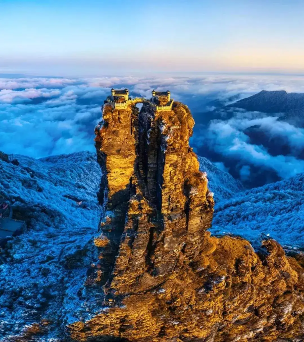 Ⅰ.攀登「红云金顶」,海拔2336米,晨间红云瑞气常饶四周,因此而得名。山峰拔地而起,垂直高差达百米,上半部分一分为二,由天桥链接,两遍各建一庙,一边供奉释迦佛,一边供奉弥勒佛。由此印证现代佛(释迦牟尼)向未来佛(弥勒佛)的交替。