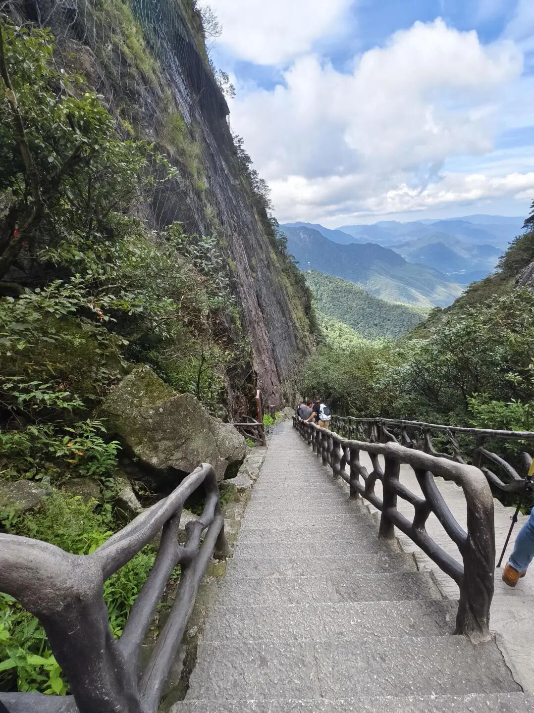 09:00 挑战好汉坡下山路段,这段路以陡峭险峻著称。坡上石阶蜿蜒曲折,两侧灌木交织,速度快的伙伴很快就能下到山脚,我们在景区正门打卡!拍照。