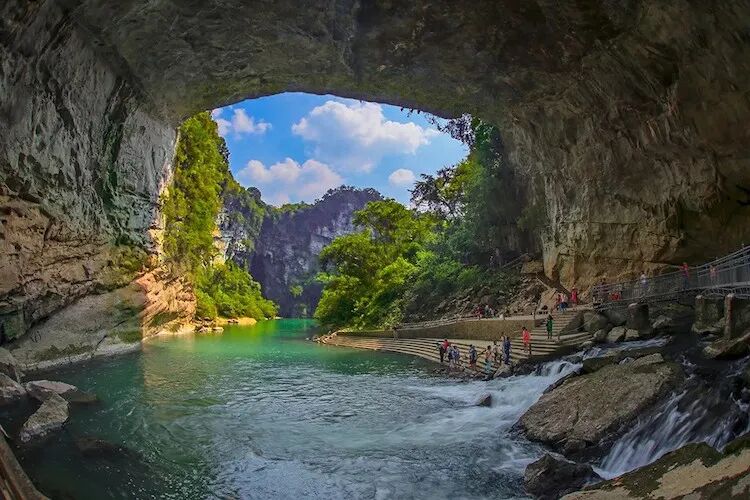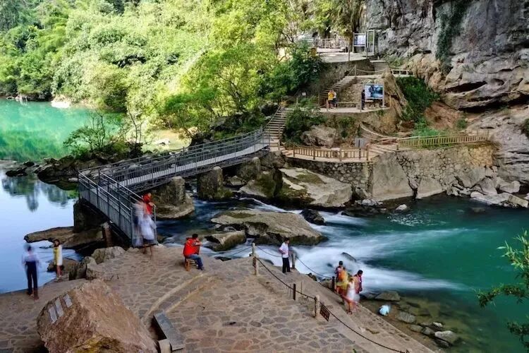 公园内zui值得一看的便是水上天生桥,它生长在峡谷两侧的青山上,是一座巨大的天然石桥,横卧在峡谷两侧的高山之巅,桥高60m,拱高50m,拱孔跨度40m,桥面厚度10m,桥面宽度40m,属中型地下成因型水上天生桥,形成独特的“一河一桥两窗”形体结构。