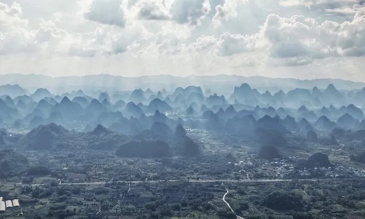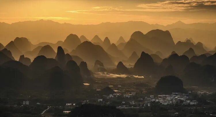 在桂林阳朔有这么一个新晋网红秘境,夕阳泼墨染群峰,山峰绵延宛如现实版“千里江山图”。