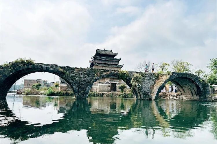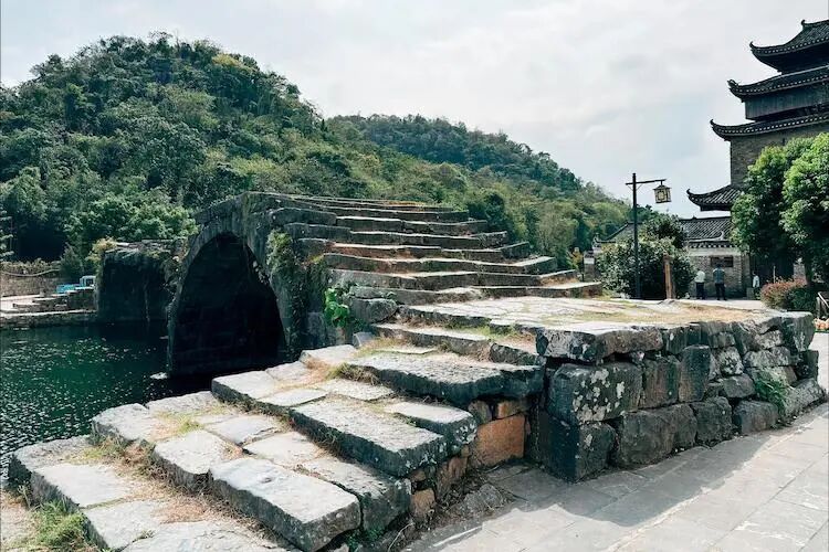 穿过文昌阁便来到了步瀛桥。南宋年间的老古董,半圆拱跨在谢沐河上。三拱两墩,站桥上跺跺脚,感觉整座桥都在嗡嗡回应你。低头看河水,清的能数水草,运气好还能瞅见鸭子排着队游过去。