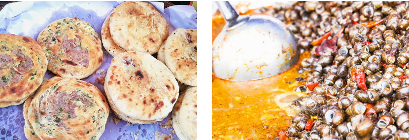 2、【烧饵块】由大米制成,抹上辣酱、麻酱、腐乳、洋芋丝等,是当地人常吃的早餐